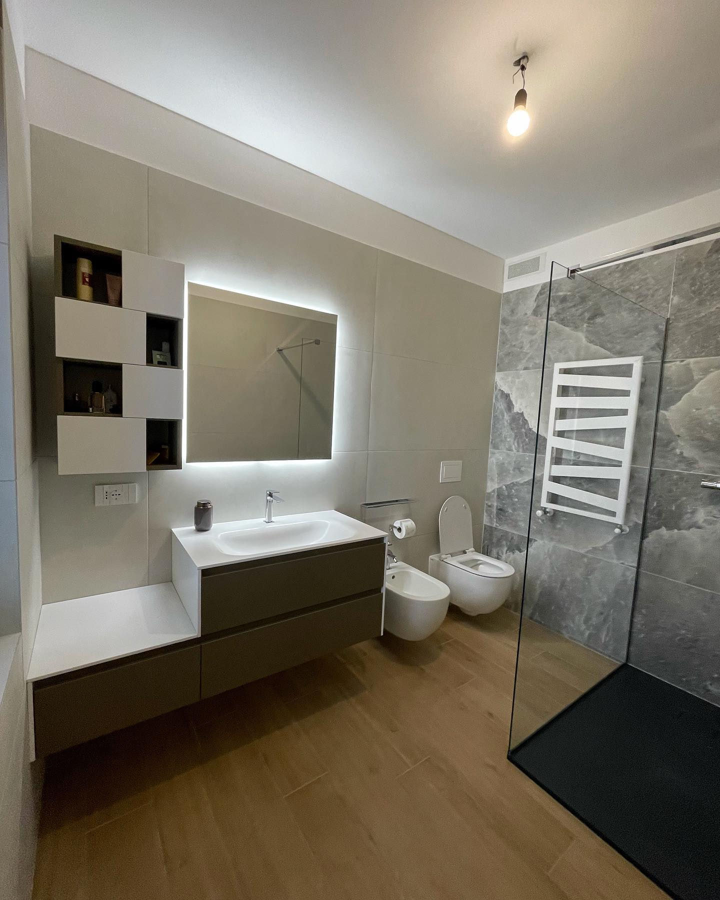 Ogni dettaglio è pensato per unire praticità e raffinatezza: piani lavabo, armadiature e soluzioni salvaspazio diventano elementi di design che rendono unico anche il più piccolo degli ambienti.